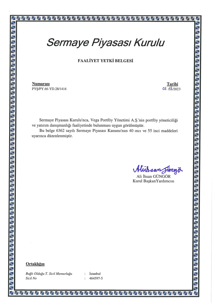 by 6 Kasım 2023 Duyurular Şirketimiz Vega Portföy Yönetimi A.Ş. 1 Kasım 2023 tarihi itibariyle Faaliyet İzni Yetki Belgesini almıştır.